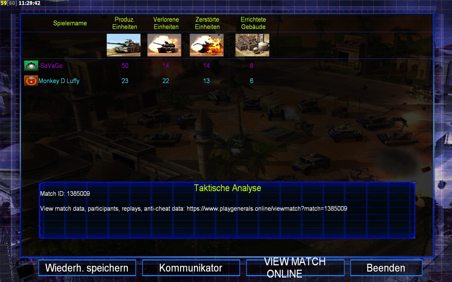 | Name | Side | Color | Team | Starting Position | Buildings Built | Buildings Lost | Buildings Destroyed | Units Built | Units Lost | Units Destroyed | Money Earned | Outcome |