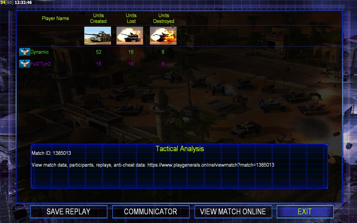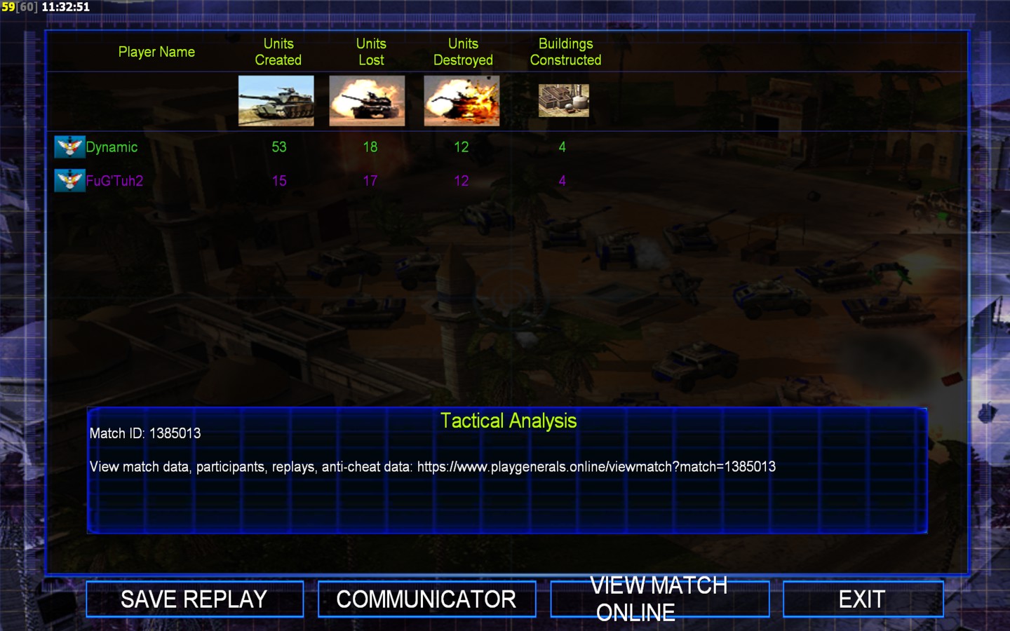 | Name | Side | Color | Team | Starting Position | Buildings Built | Buildings Lost | Buildings Destroyed | Units Built | Units Lost | Units Destroyed | Money Earned | Outcome |