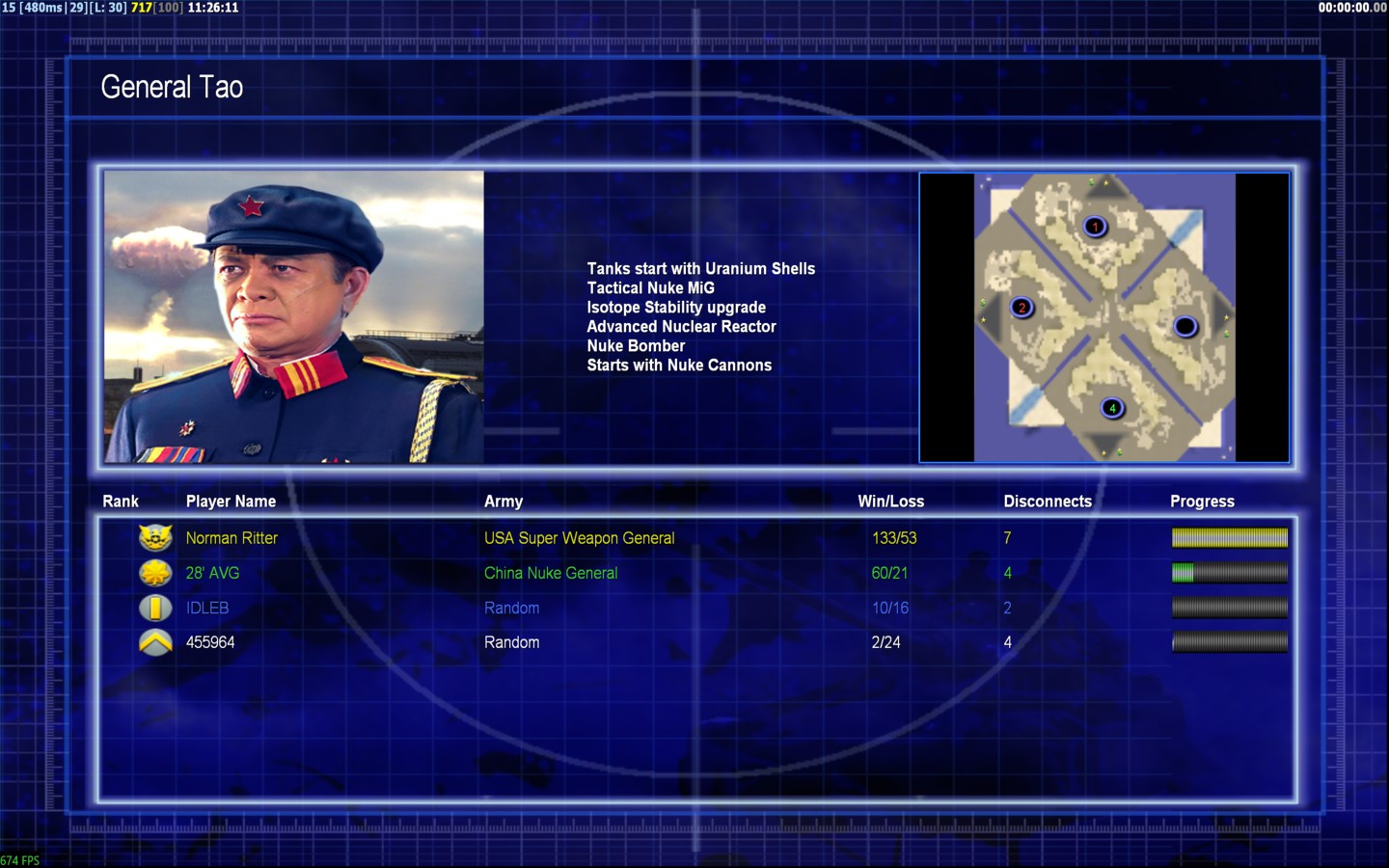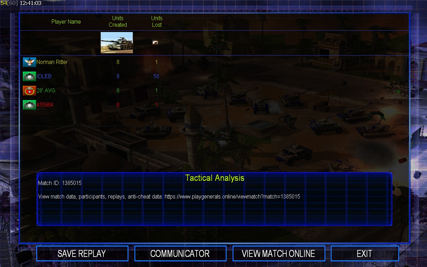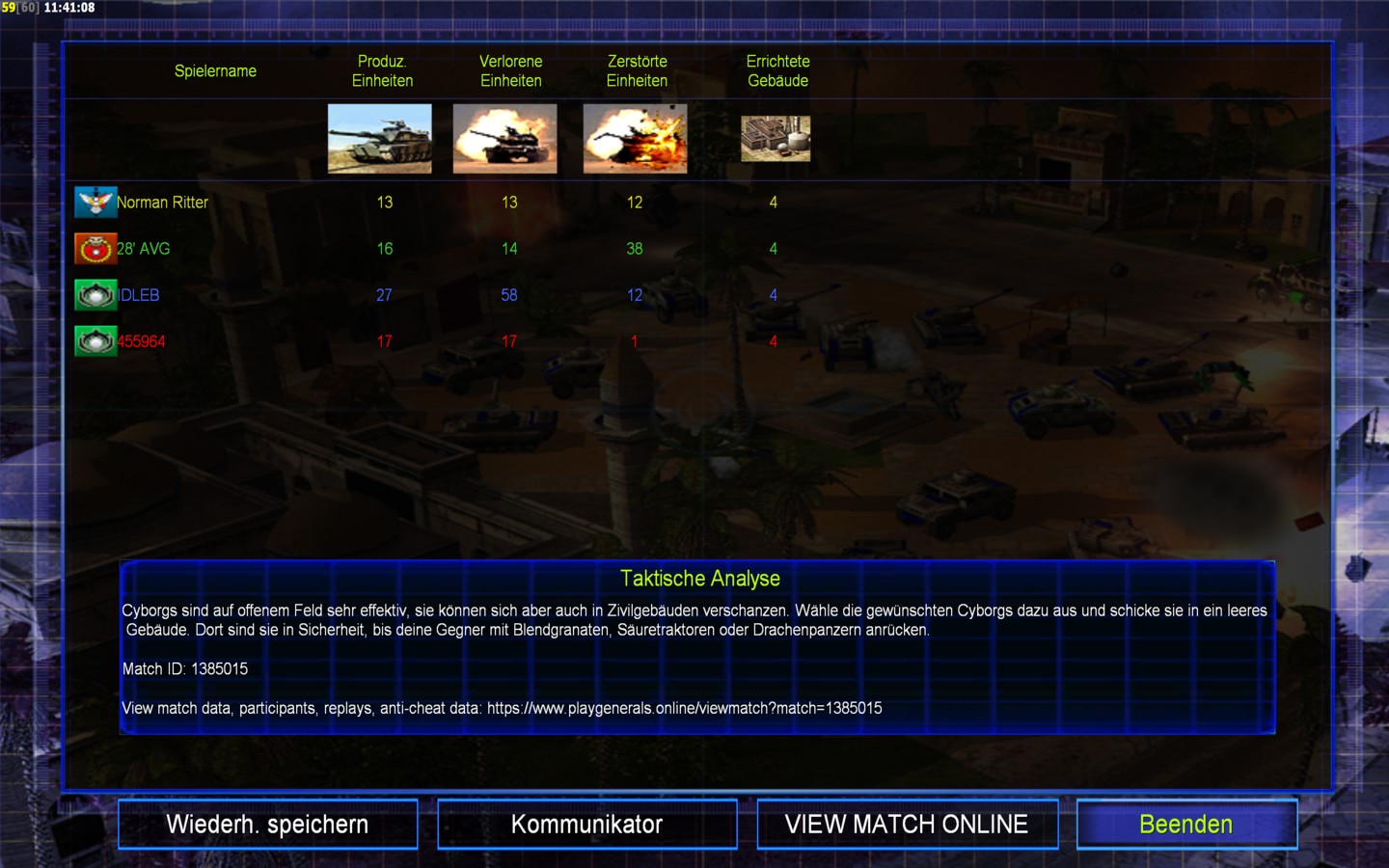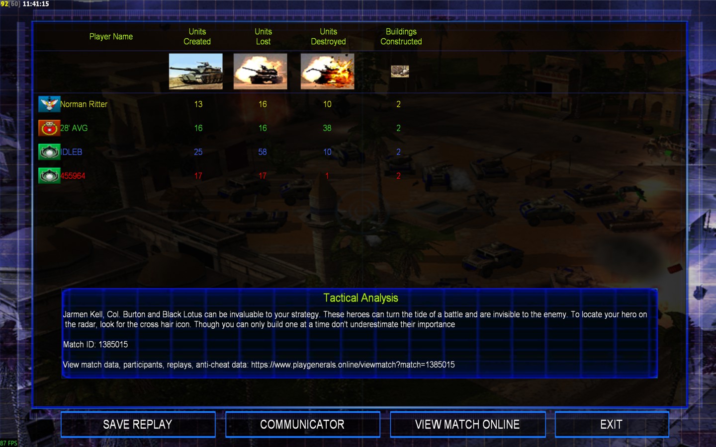 | NameIDLEB | Side | Color | Team1 | Starting PositionNone | Buildings Built11 | Buildings Lost11 | Buildings Destroyed2 | Units Built29 | Units Lost58 | Units Destroyed14 | Money Earned16770 | OutcomeLost |
