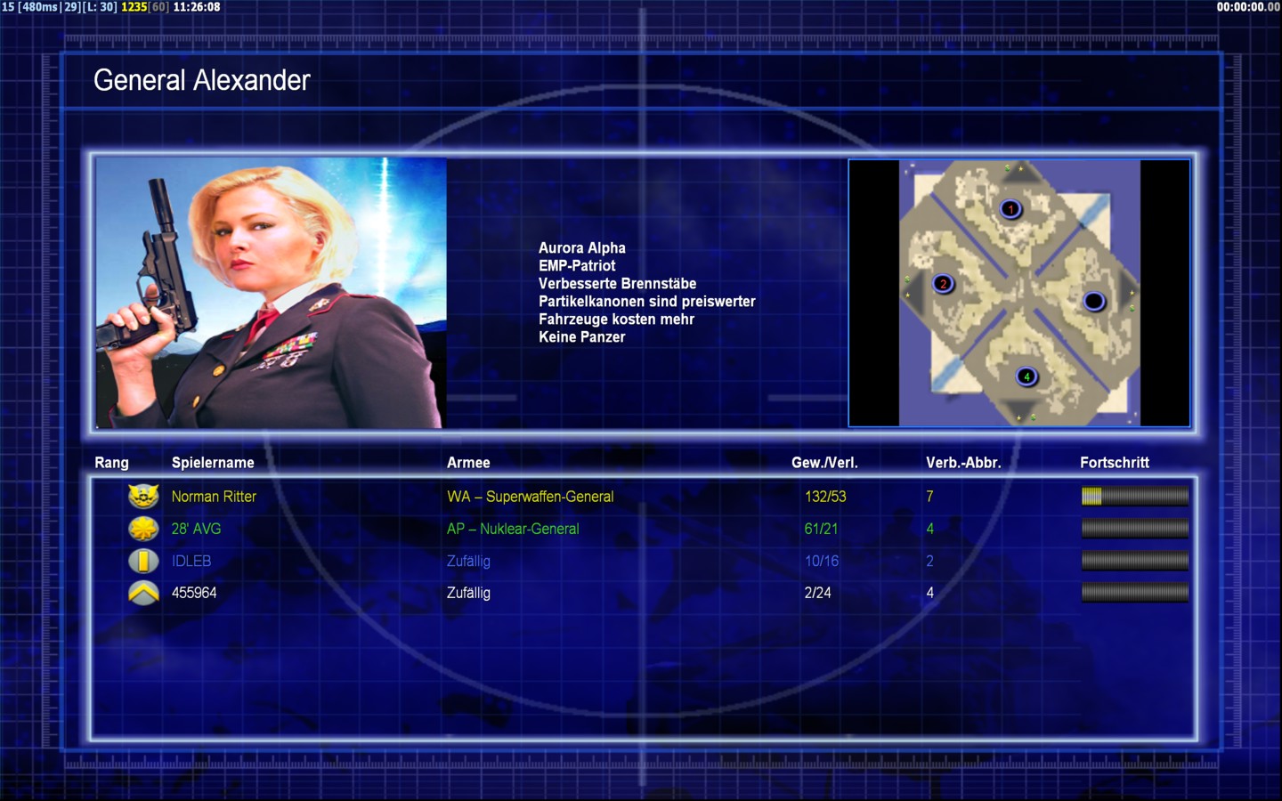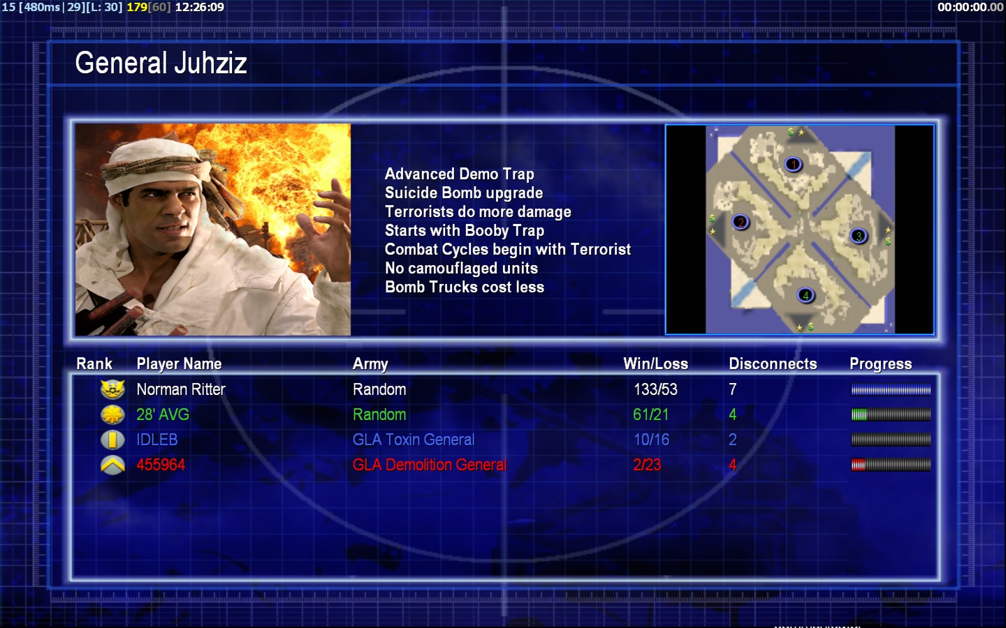 | Name | Side | Color | Team | Starting Position | Buildings Built | Buildings Lost | Buildings Destroyed | Units Built | Units Lost | Units Destroyed | Money Earned | Outcome |