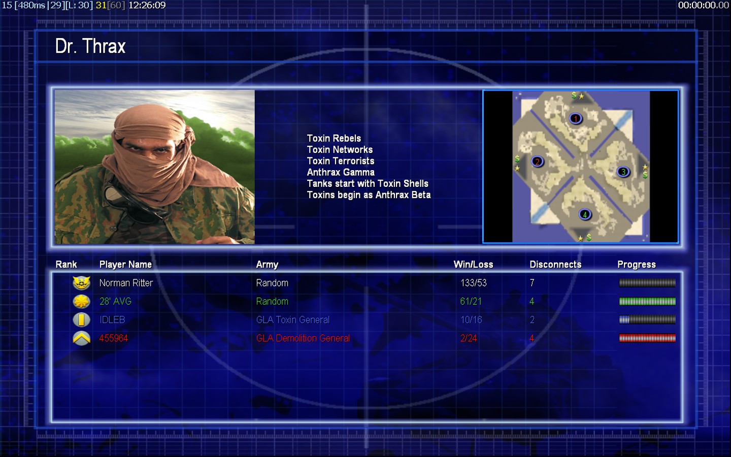 | NameNorman Ritter | Side | Color | Team0 | Starting Position0 | Buildings Built14 | Buildings Lost2 | Buildings Destroyed5 | Units Built13 | Units Lost12 | Units Destroyed27 | Money Earned23850 | OutcomeWon |