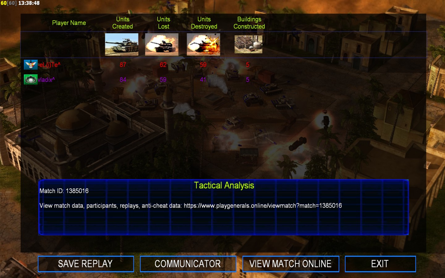 Color | TeamNone | Starting PositionNone | Buildings Built11 | Buildings Lost2 | Buildings Destroyed10 | Units Built86 | Units Lost62 | Units Destroyed59 | Money Earned69480 | OutcomeWon |