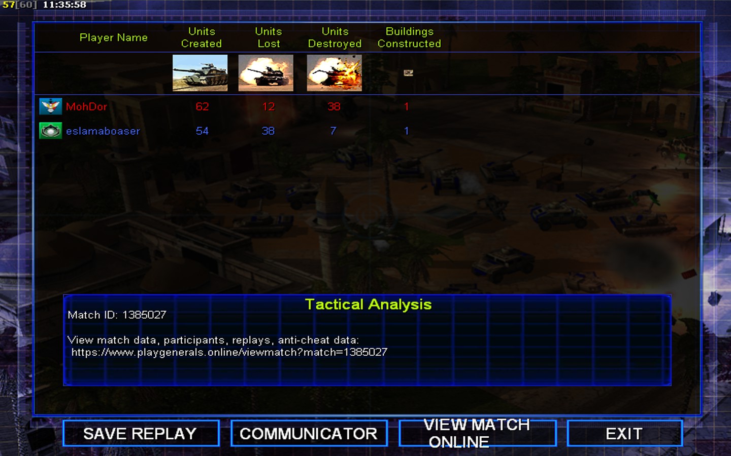 | Name | Side | Color | Team | Starting Position | Buildings Built | Buildings Lost | Buildings Destroyed | Units Built | Units Lost | Units Destroyed | Money Earned | Outcome |