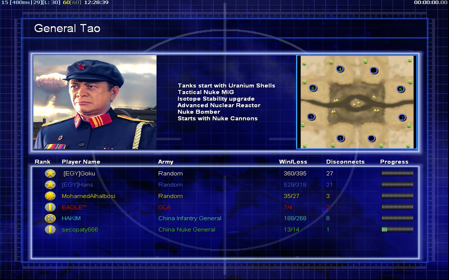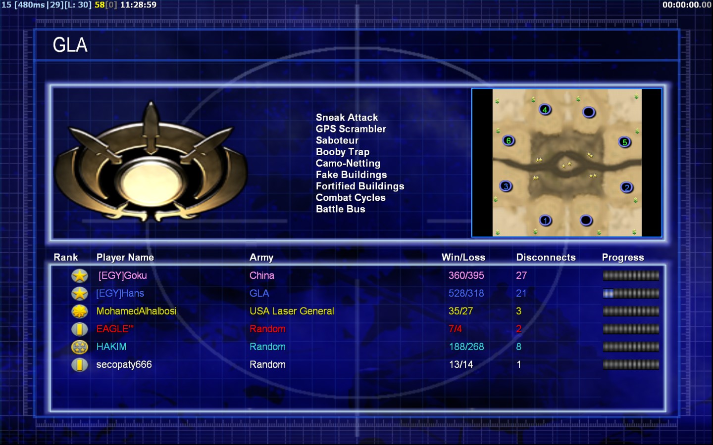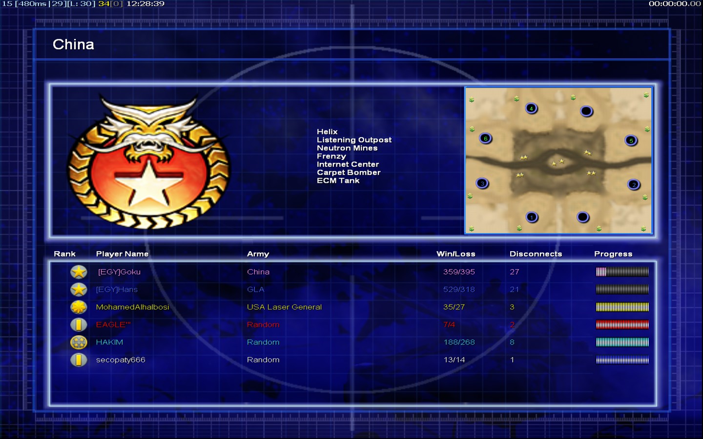 | Name [EGY]Goku | Side | Color | Team2 | Starting Position6 | Buildings Built1 | Buildings Lost0 | Buildings Destroyed0 | Units Built2 | Units Lost0 | Units Destroyed0 | Money Earned0 | OutcomeWon |
