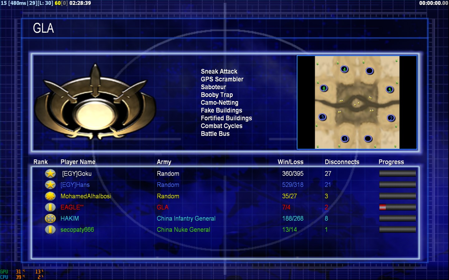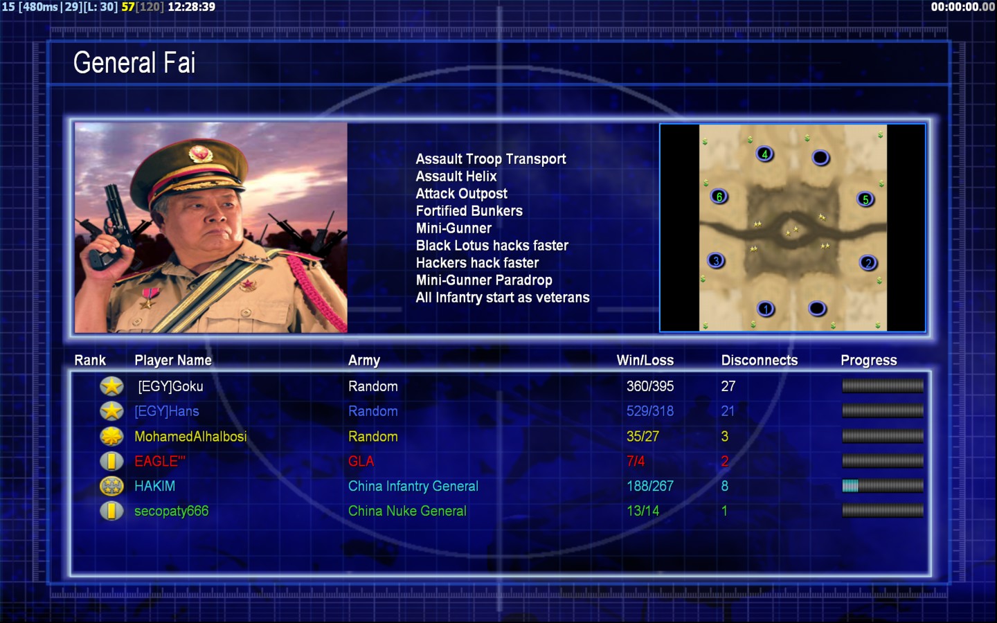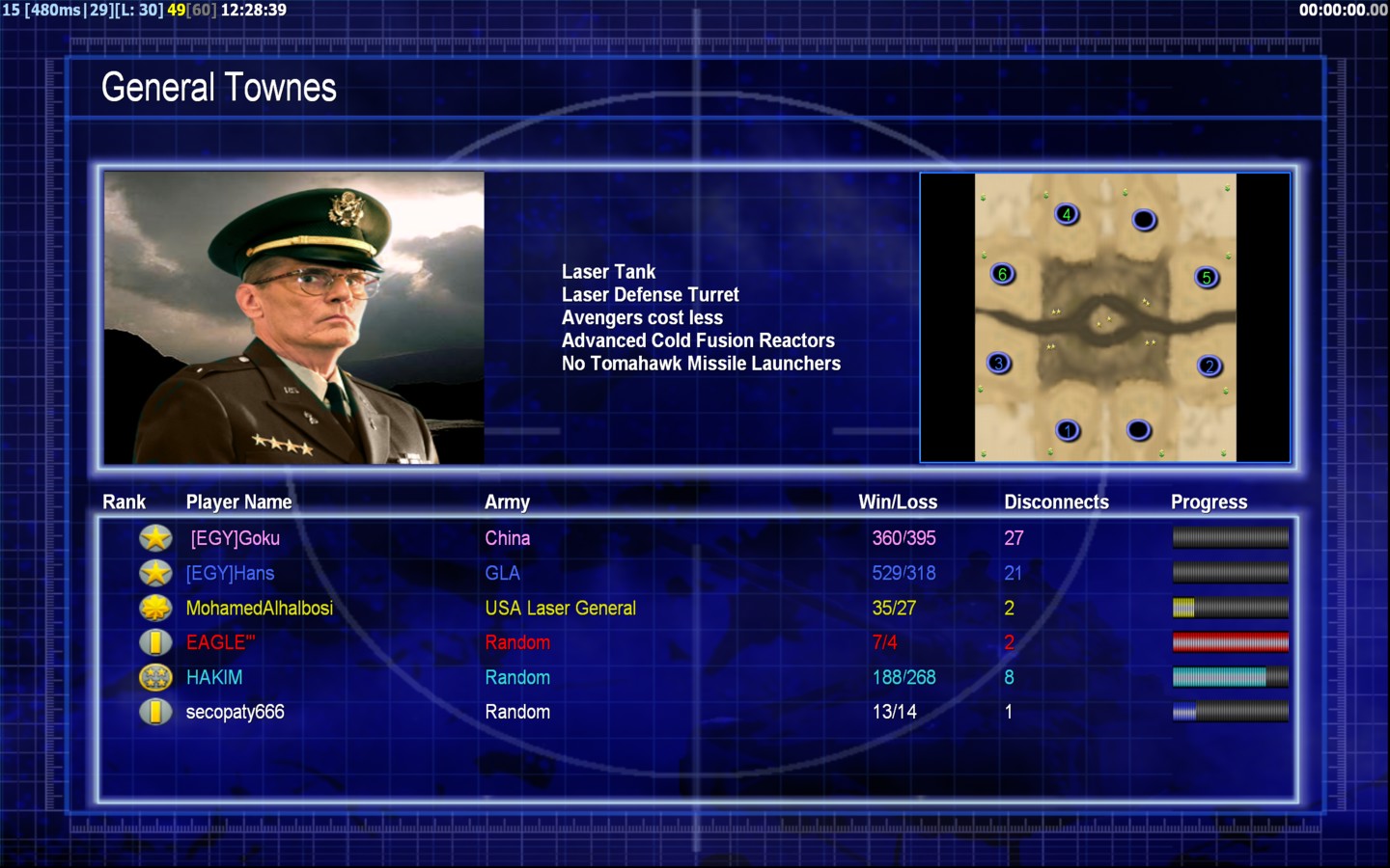 | Name [EGY]Goku | Side | Color | Team2 | Starting Position6 | Buildings Built1 | Buildings Lost0 | Buildings Destroyed0 | Units Built2 | Units Lost0 | Units Destroyed0 | Money Earned0 | OutcomeWon |