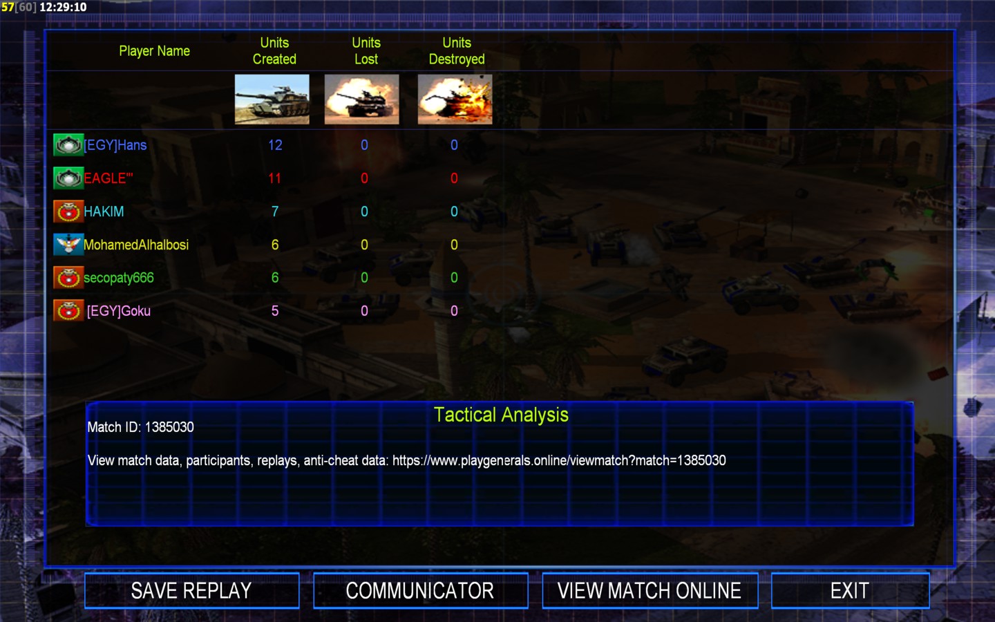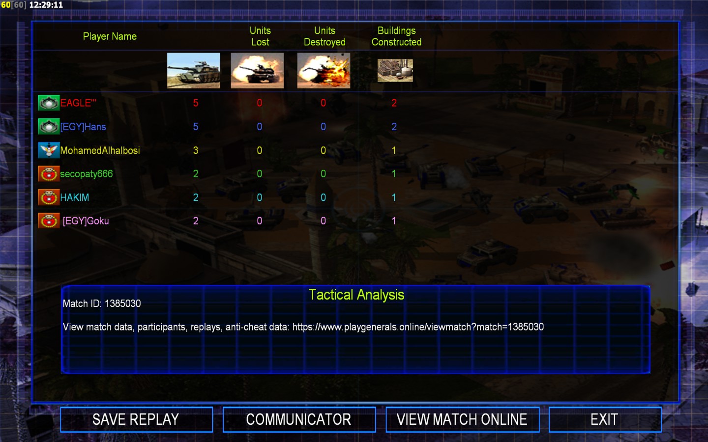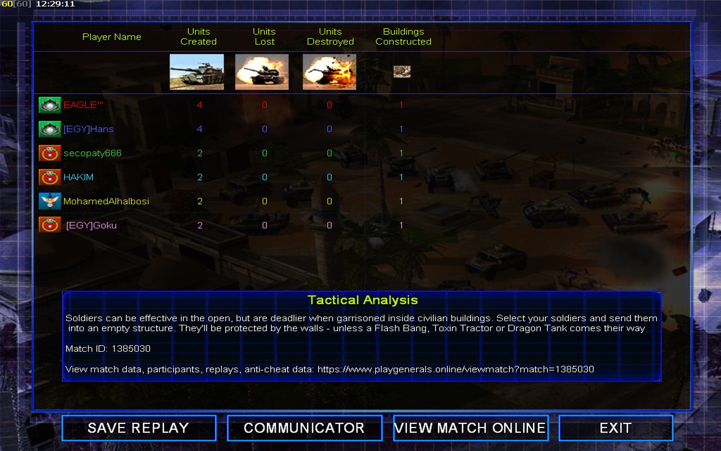 | NameEAGLE''' | Side | Color | Team1 | Starting Position1 | Buildings Built2 | Buildings Lost0 | Buildings Destroyed0 | Units Built11 | Units Lost0 | Units Destroyed0 | Money Earned0 | OutcomeLost |
