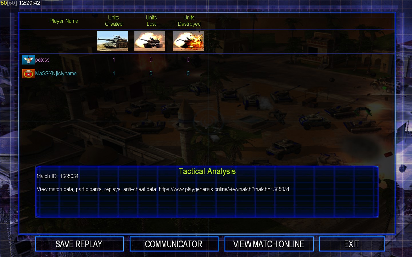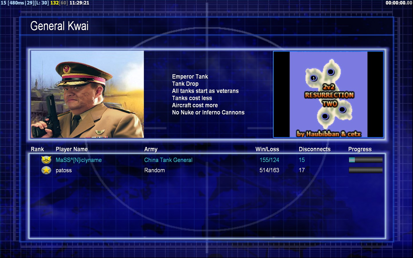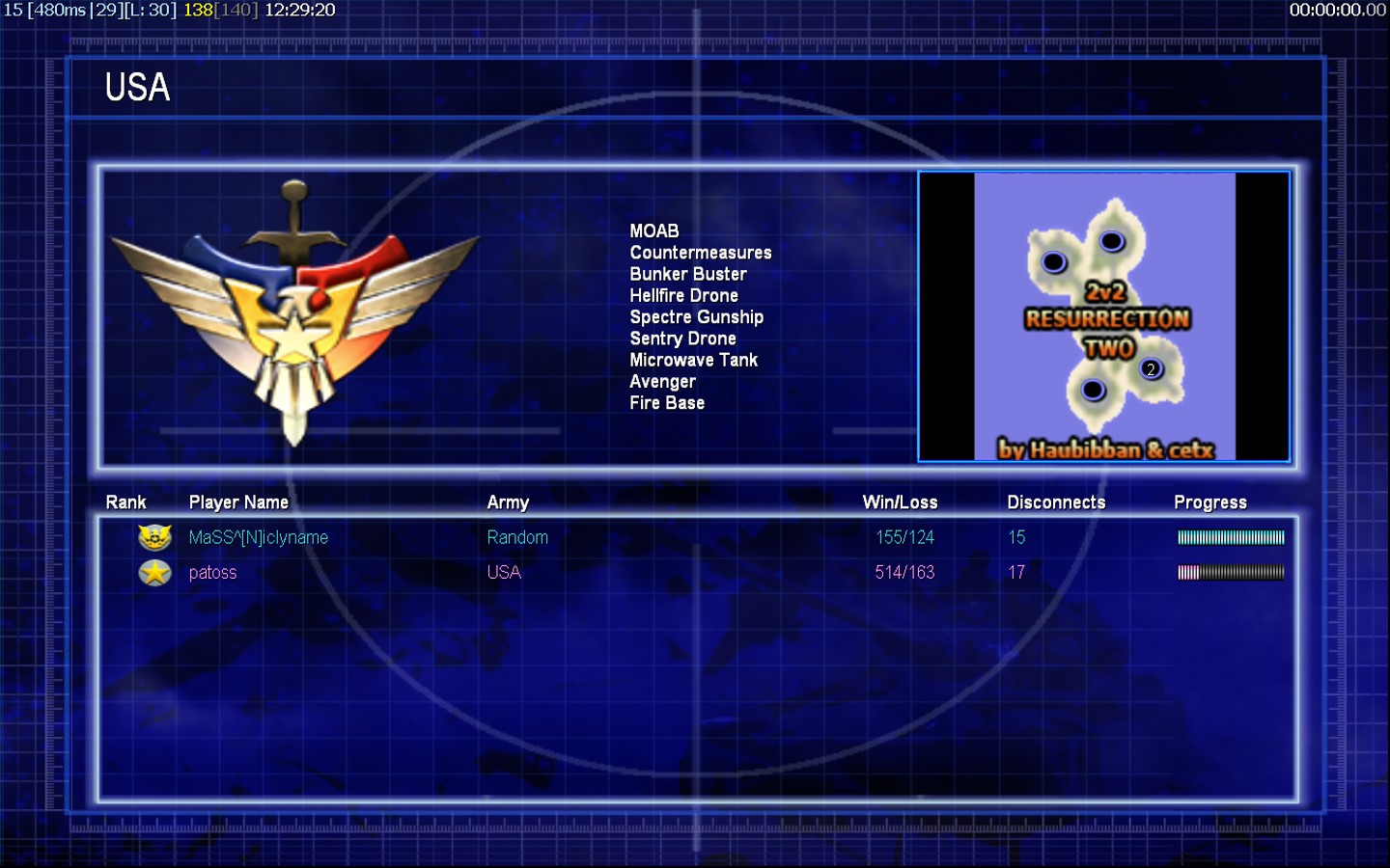 | NameMaSS^[N]iclyname | Side | Color | TeamNone | Starting PositionNone | Buildings Built1 | Buildings Lost0 | Buildings Destroyed0 | Units Built1 | Units Lost0 | Units Destroyed0 | Money Earned0 | OutcomeLost |