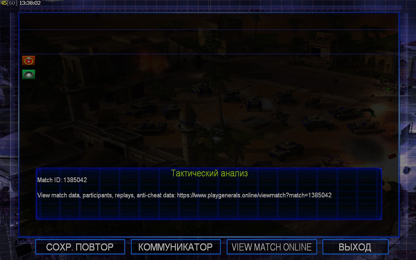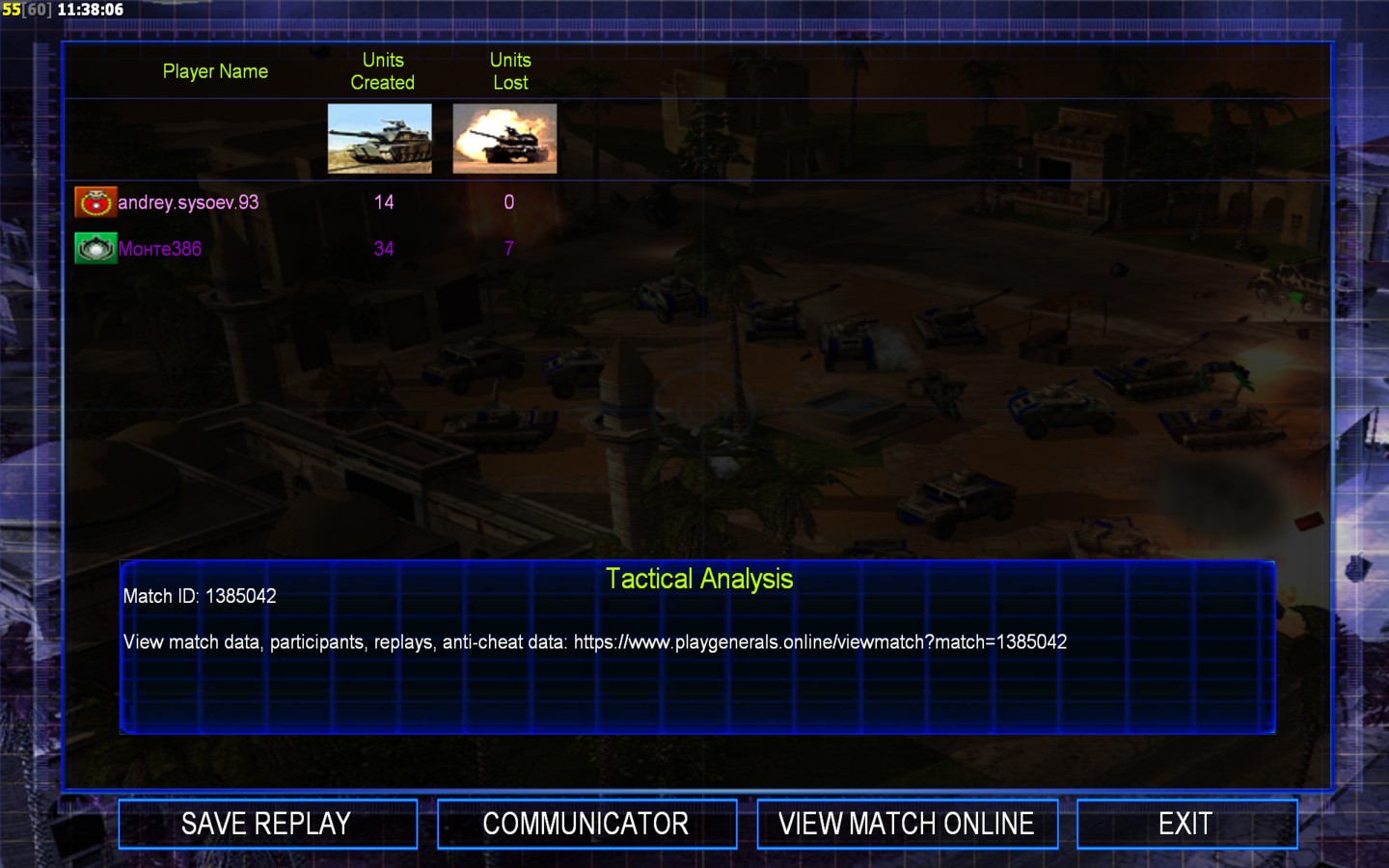 | Name | Side | Color | Team | Starting Position | Buildings Built | Buildings Lost | Buildings Destroyed | Units Built | Units Lost | Units Destroyed | Money Earned | Outcome |