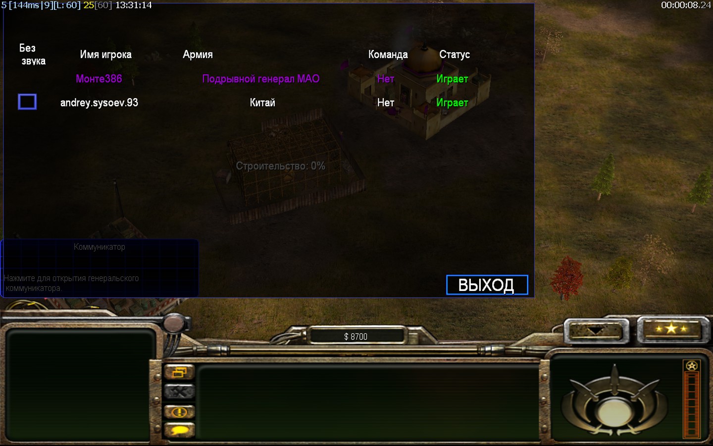 Color | TeamNone | Starting PositionNone | Buildings Built10 | Buildings Lost7 | Buildings Destroyed0 | Units Built34 | Units Lost9 | Units Destroyed0 | Money Earned8400 | OutcomeLost |