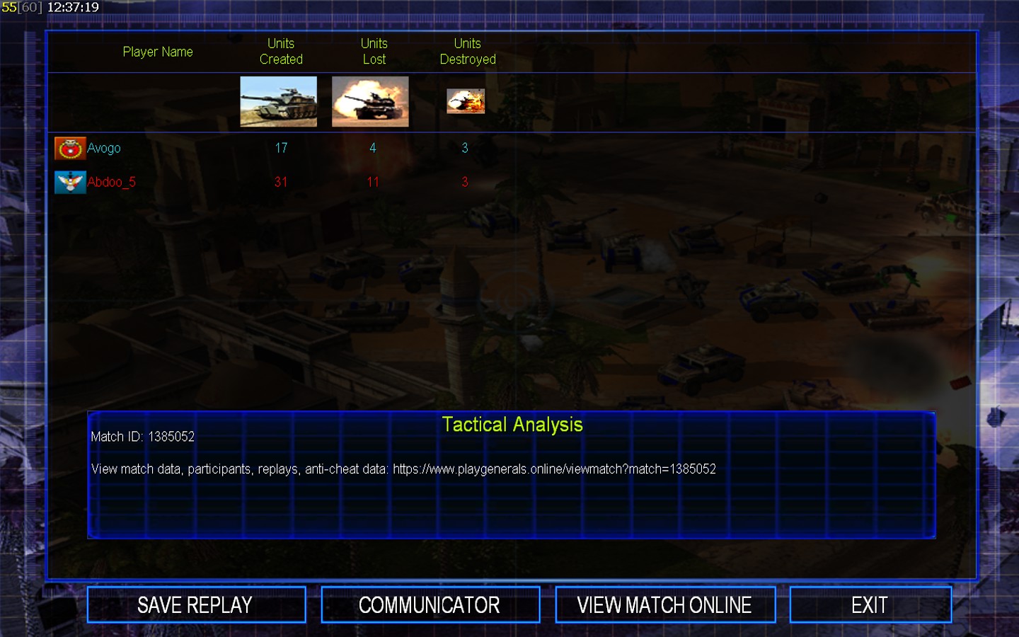 | Name | Side | Color | Team | Starting Position | Buildings Built | Buildings Lost | Buildings Destroyed | Units Built | Units Lost | Units Destroyed | Money Earned | Outcome |