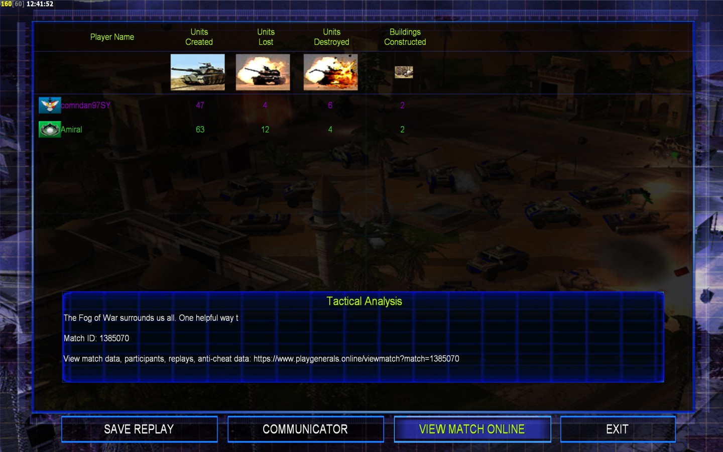 | Name | Side | Color | Team | Starting Position | Buildings Built | Buildings Lost | Buildings Destroyed | Units Built | Units Lost | Units Destroyed | Money Earned | Outcome |
