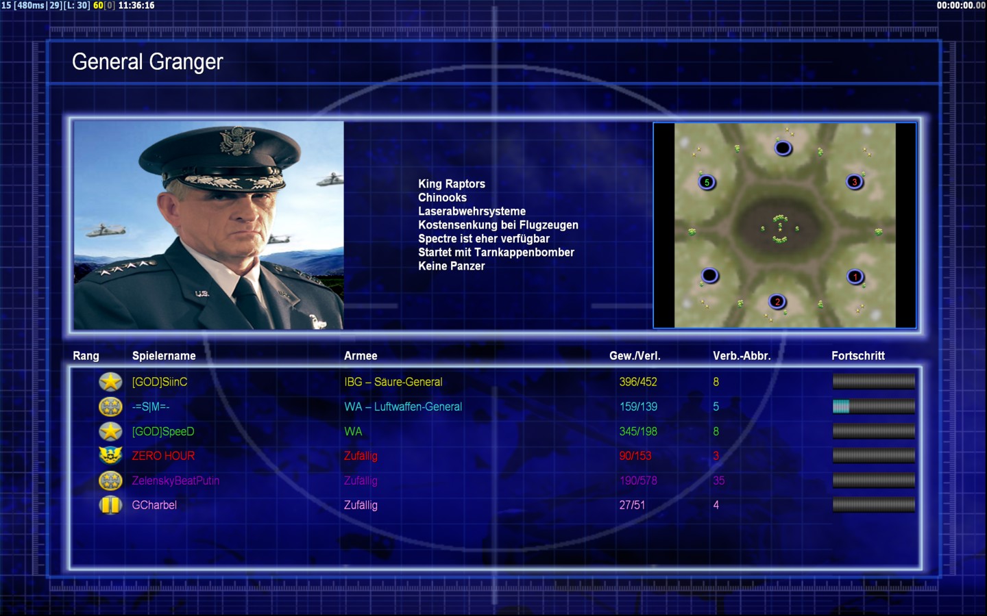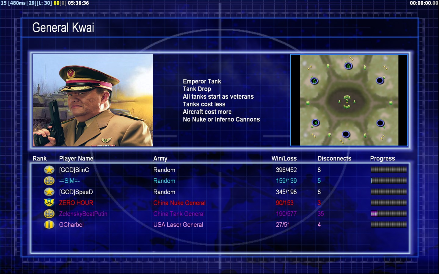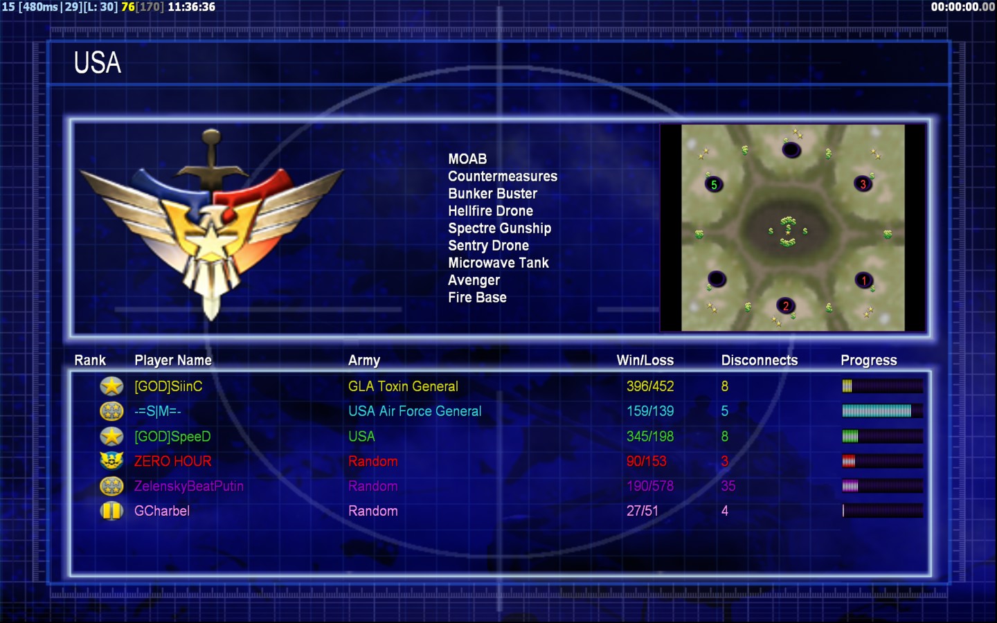 | Name[GOD]SpeeD | Side | Color | Team0 | Starting PositionNone | Buildings Built4 | Buildings Lost0 | Buildings Destroyed0 | Units Built6 | Units Lost0 | Units Destroyed0 | Money Earned0 | OutcomeLost |