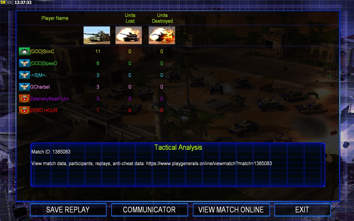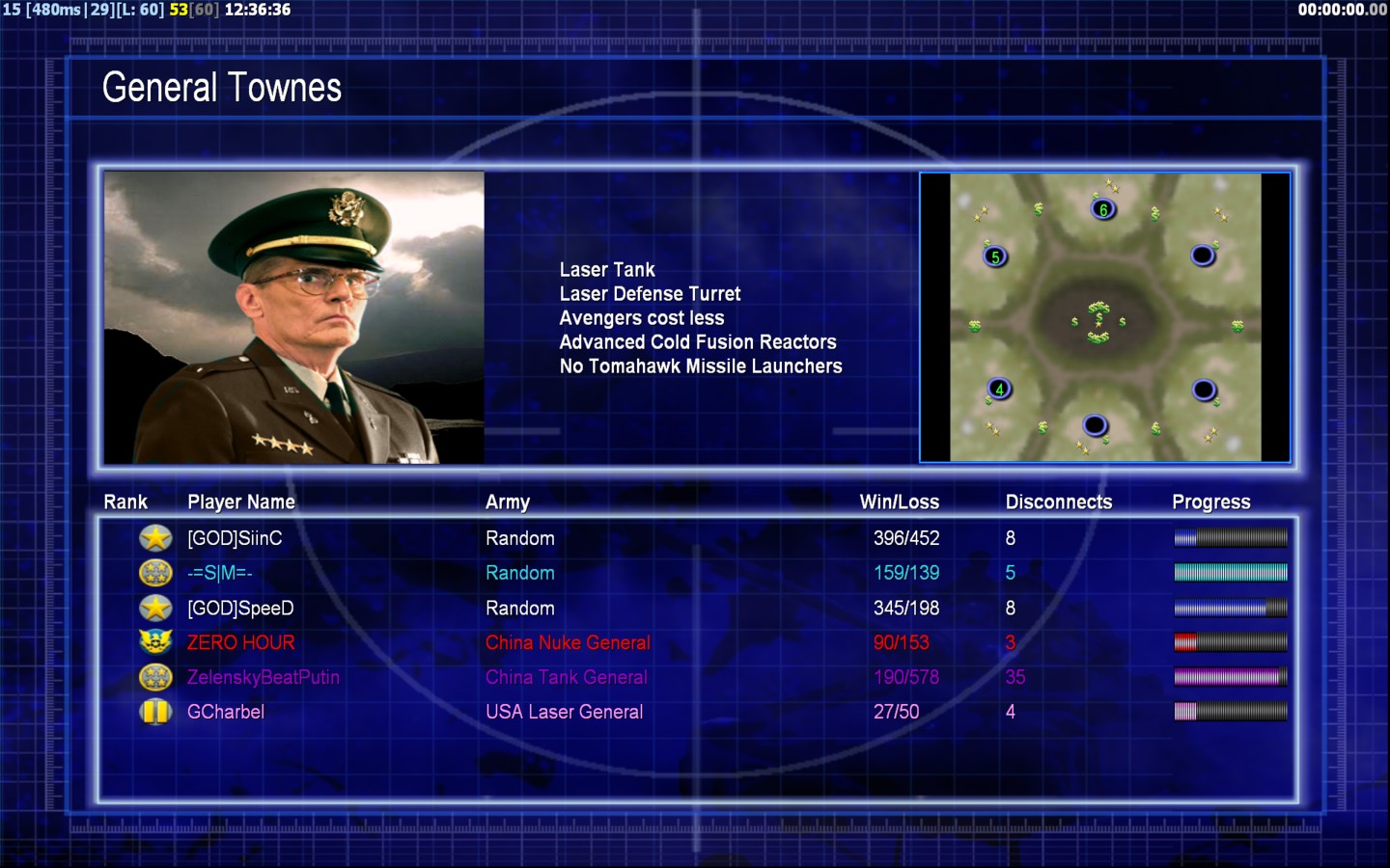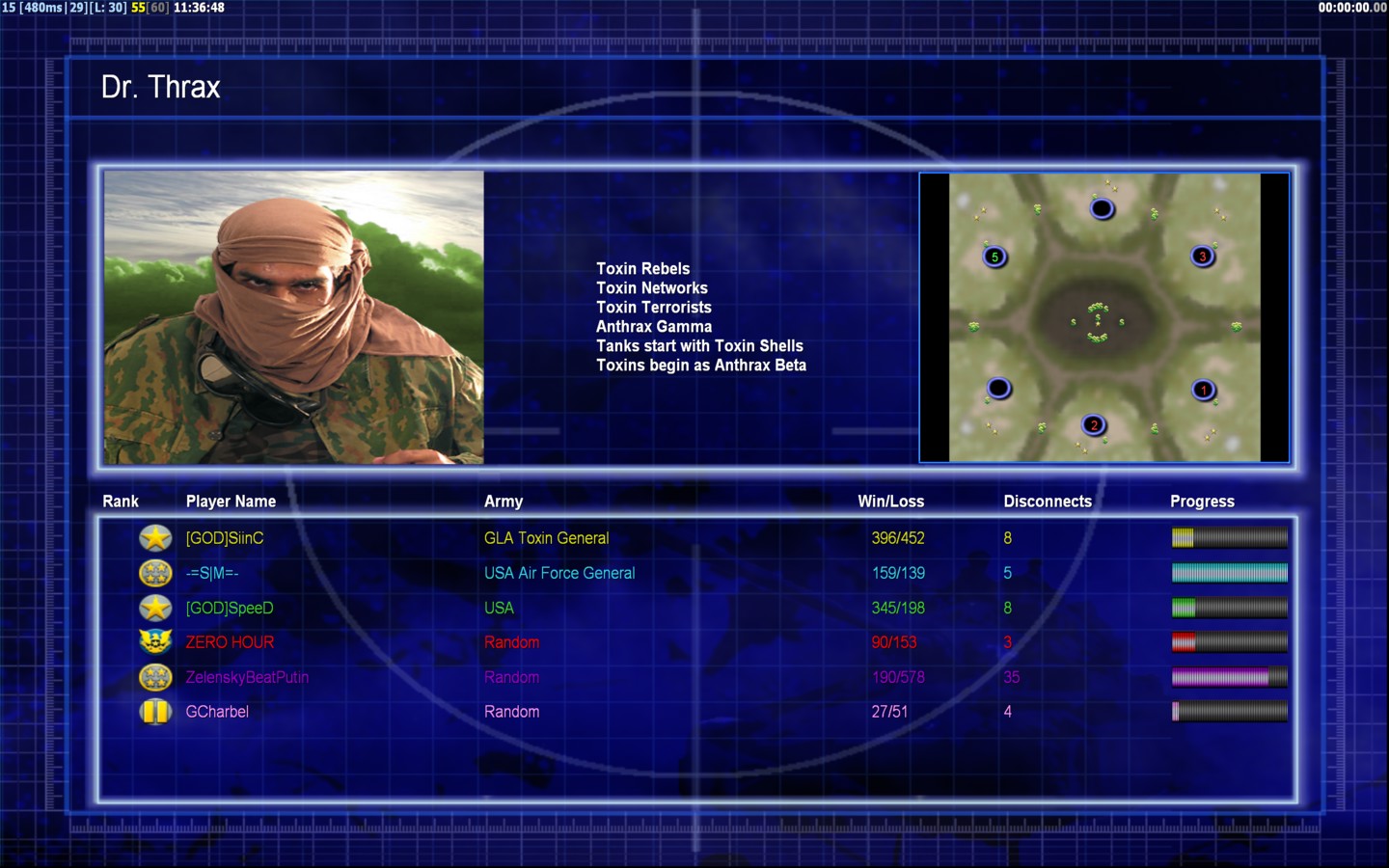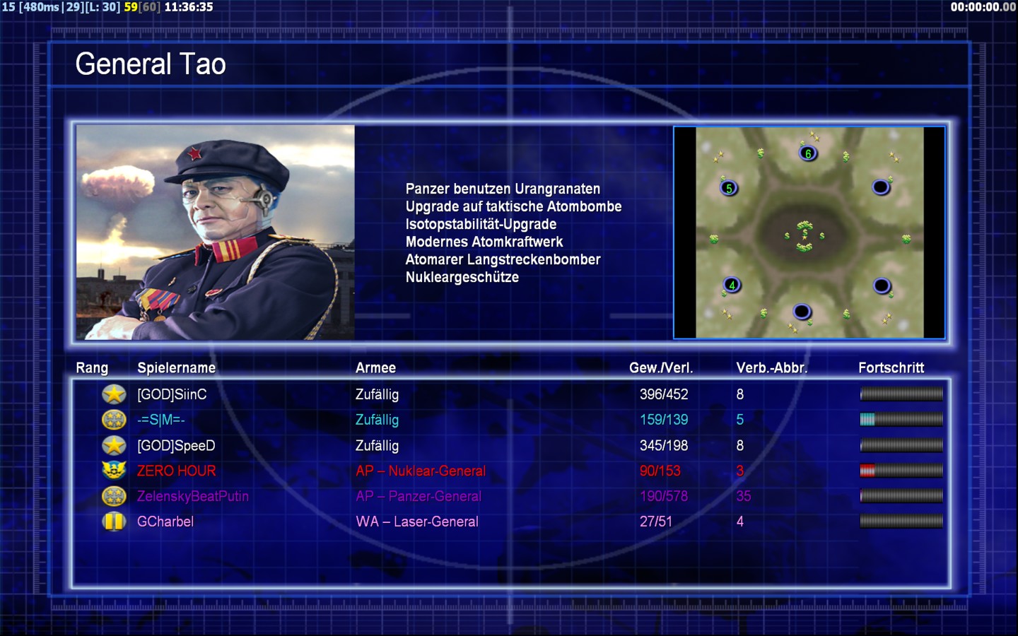 | Name[GOD]SpeeD | Side | Color | Team0 | Starting PositionNone | Buildings Built4 | Buildings Lost0 | Buildings Destroyed0 | Units Built6 | Units Lost0 | Units Destroyed0 | Money Earned0 | OutcomeLost |