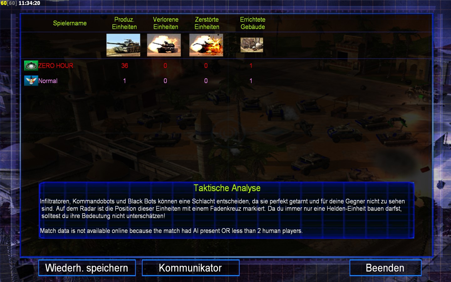 | NameZERO HOUR | Side | Color | Team1 | Starting PositionNone | Buildings Built2 | Buildings Lost0 | Buildings Destroyed0 | Units Built1 | Units Lost0 | Units Destroyed0 | Money Earned0 | OutcomeWon |
