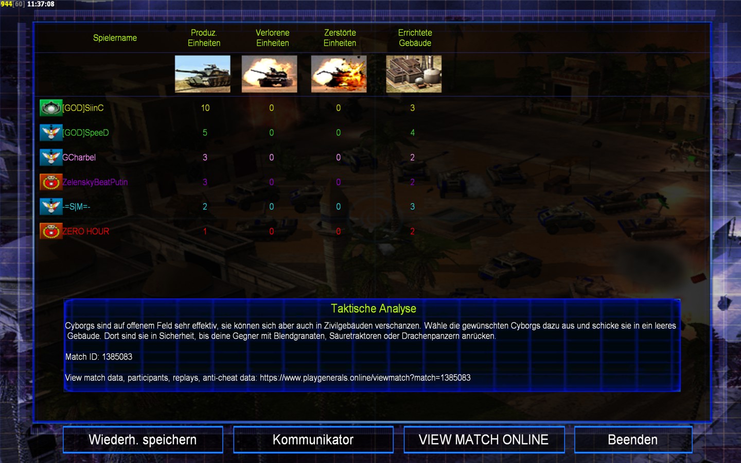 | NameZelenskyBeatPutin | Side | Color | Team1 | Starting Position3 | Buildings Built4 | Buildings Lost0 | Buildings Destroyed0 | Units Built4 | Units Lost0 | Units Destroyed0 | Money Earned1200 | OutcomeWon |