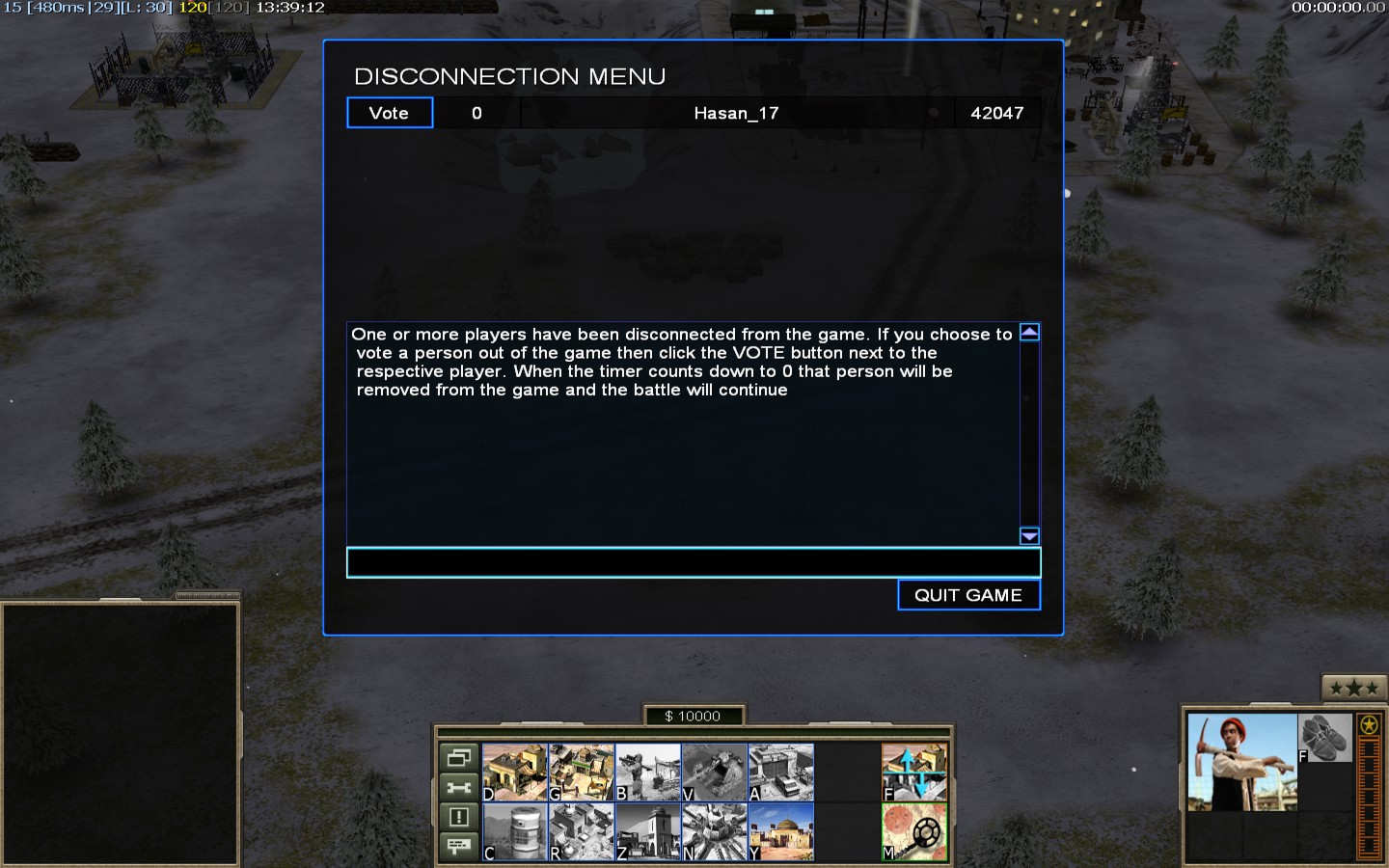 | Name | Side | Color | Team | Starting Position | Buildings Built | Buildings Lost | Buildings Destroyed | Units Built | Units Lost | Units Destroyed | Money Earned | Outcome |