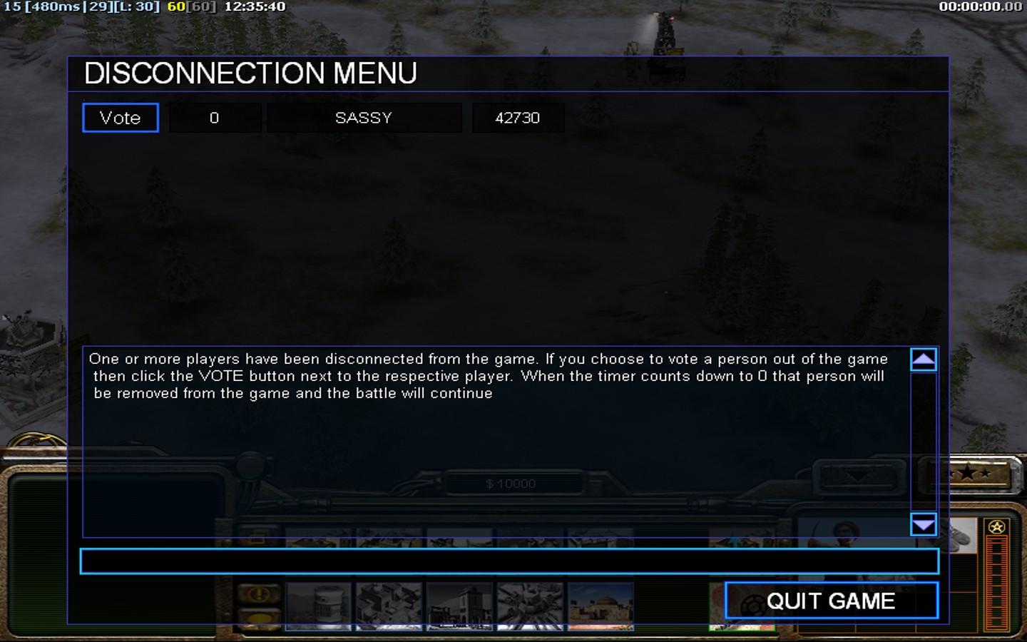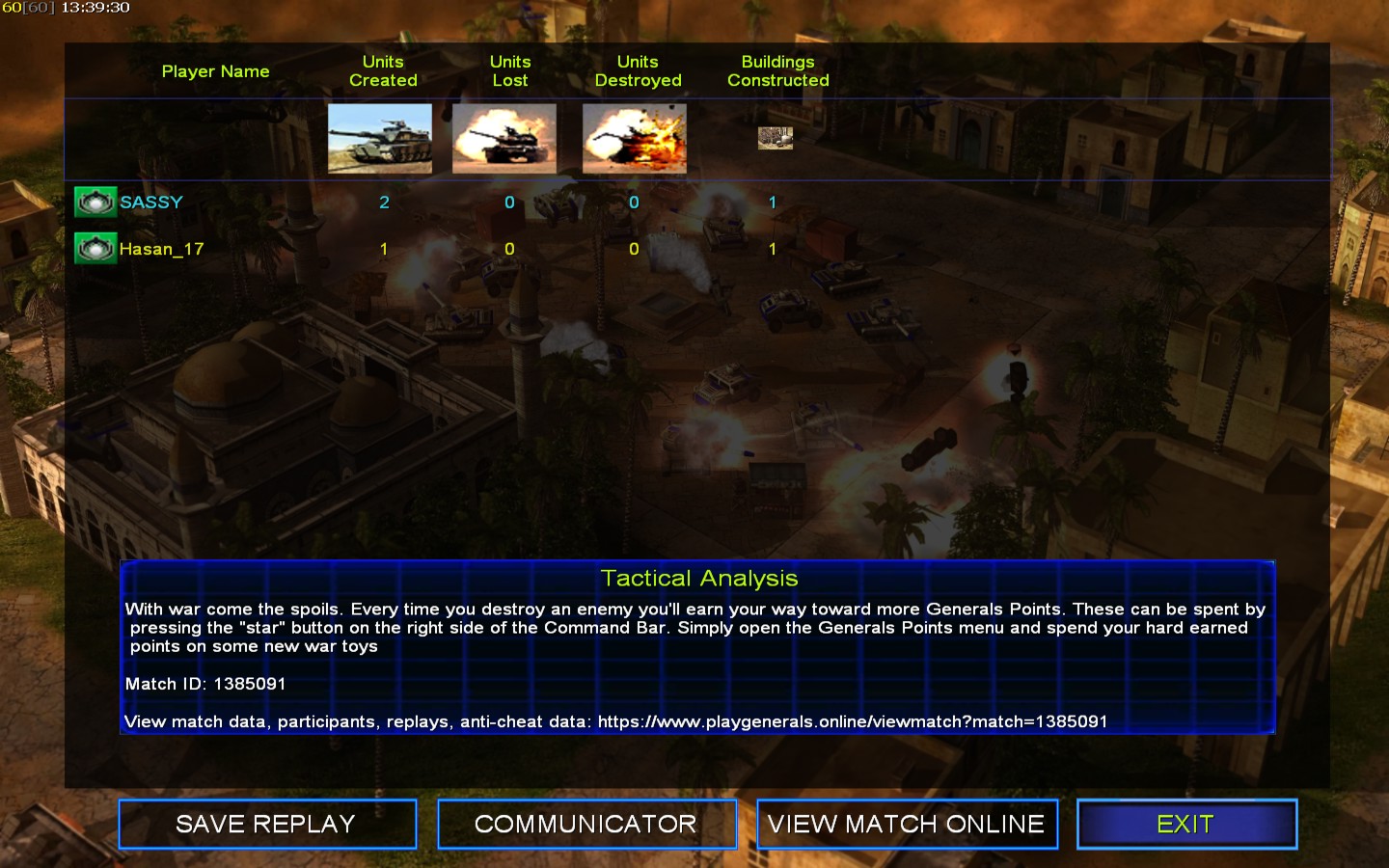Color | TeamNone | Starting PositionNone | Buildings Built1 | Buildings Lost0 | Buildings Destroyed0 | Units Built1 | Units Lost0 | Units Destroyed0 | Money Earned0 | OutcomeWon |