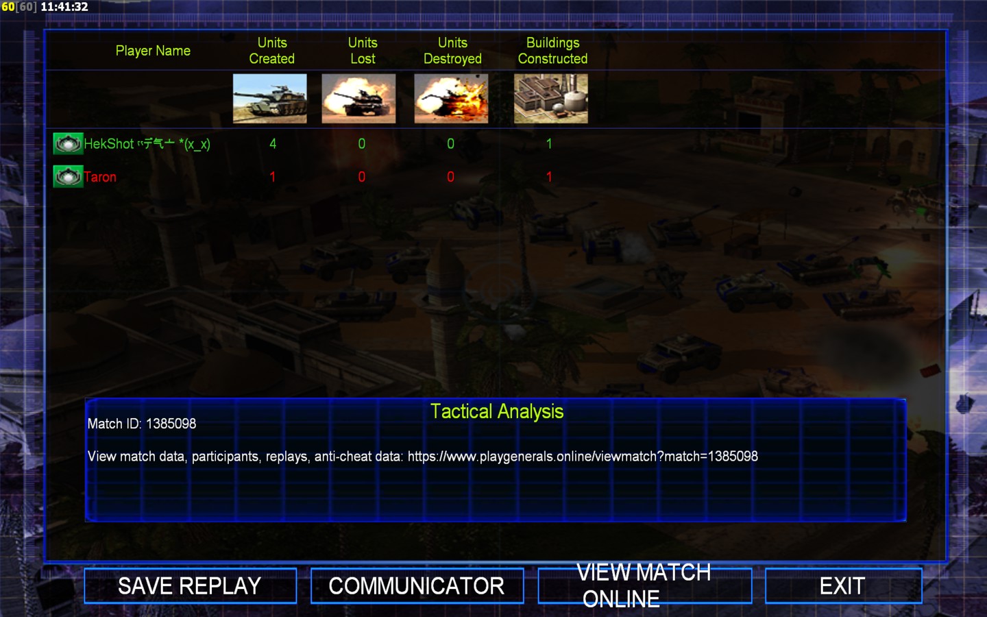 | Name | Side | Color | Team | Starting Position | Buildings Built | Buildings Lost | Buildings Destroyed | Units Built | Units Lost | Units Destroyed | Money Earned | Outcome |