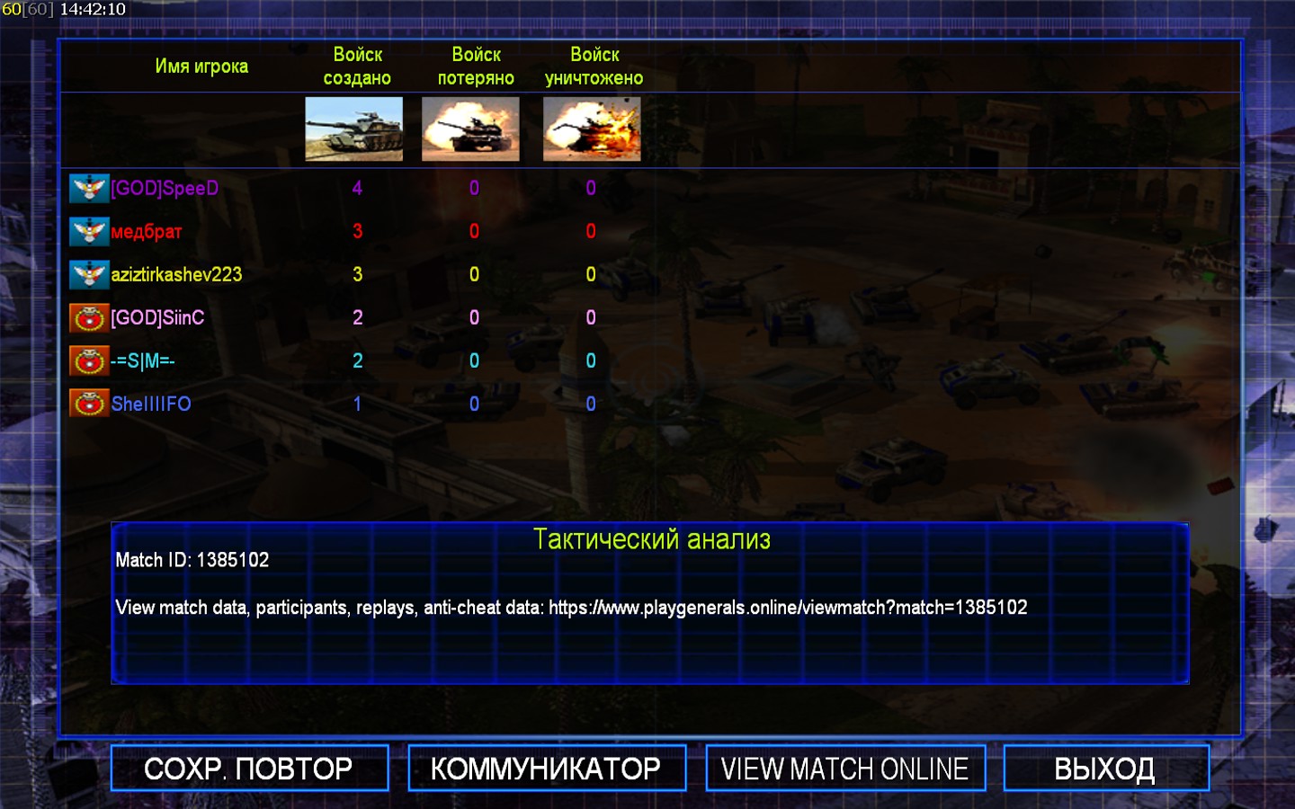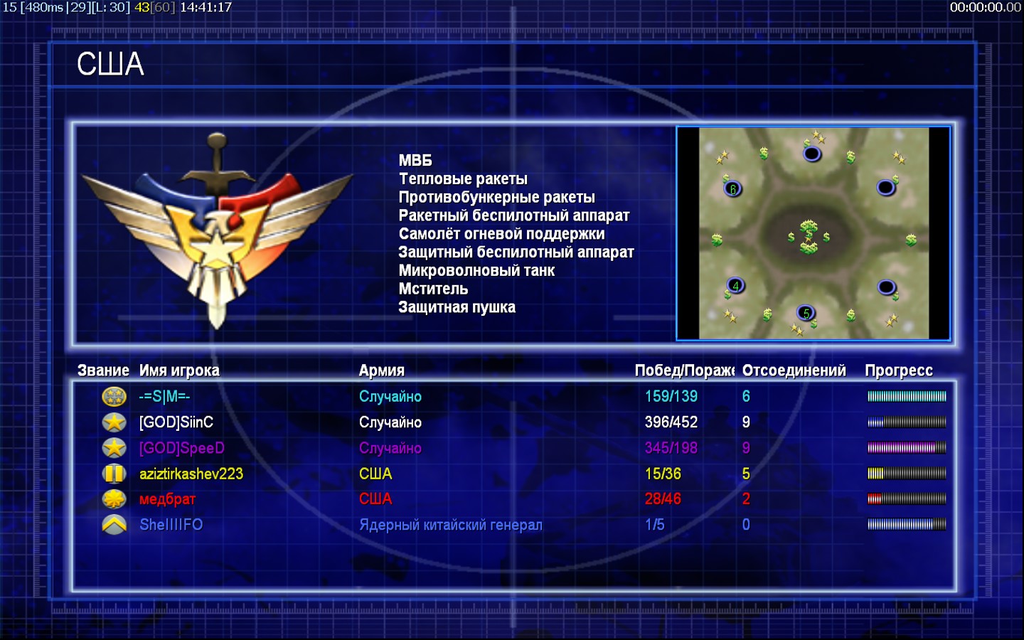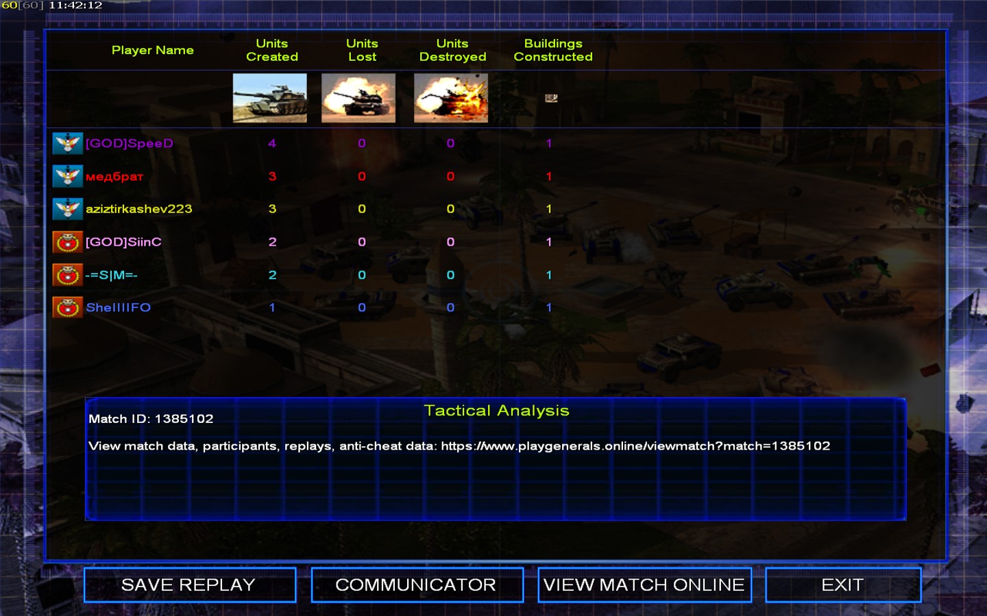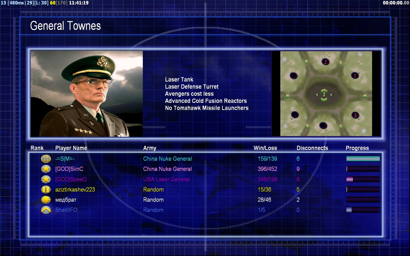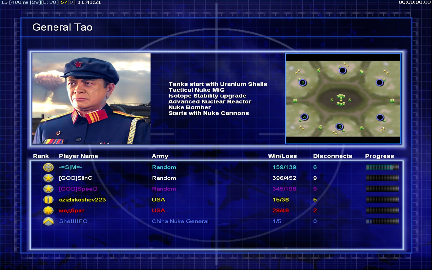 | Nameмедбрат | Side | Color | Team1 | Starting PositionNone | Buildings Built3 | Buildings Lost0 | Buildings Destroyed0 | Units Built3 | Units Lost0 | Units Destroyed0 | Money Earned0 | OutcomeLost |