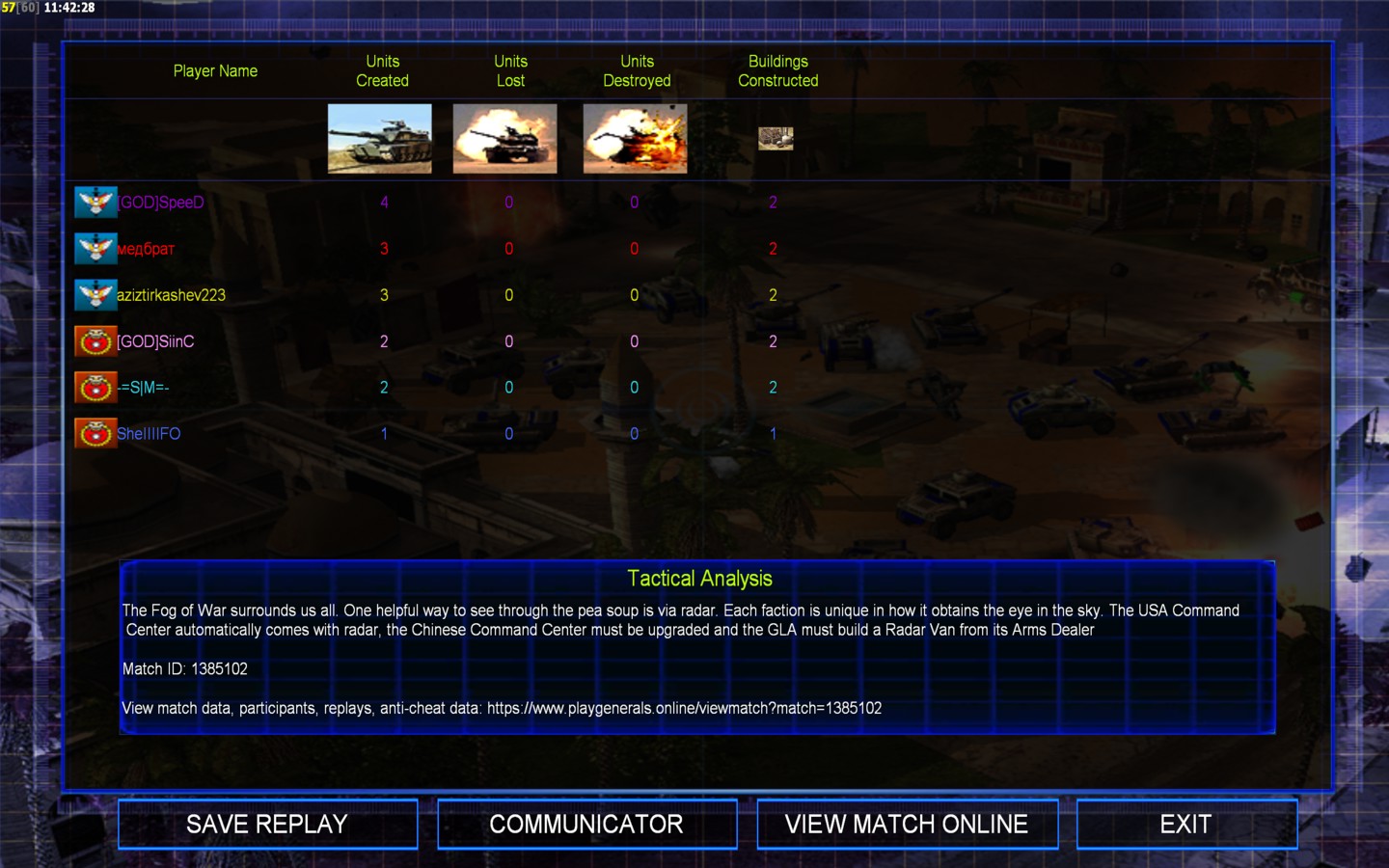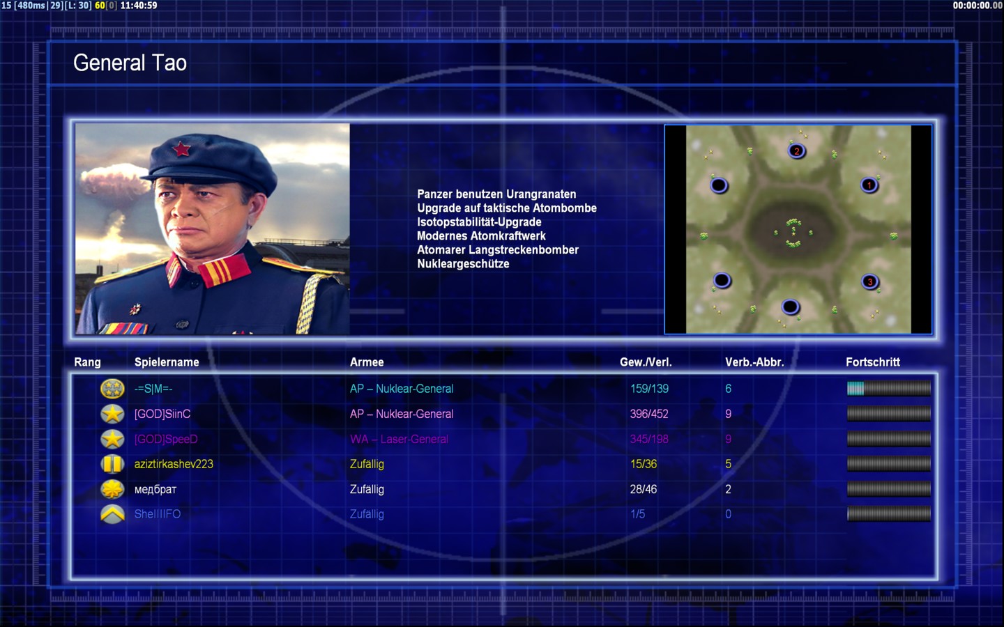 | Name[GOD]SpeeD | Side | Color | Team0 | Starting PositionNone | Buildings Built4 | Buildings Lost0 | Buildings Destroyed0 | Units Built4 | Units Lost0 | Units Destroyed0 | Money Earned0 | OutcomeWon |