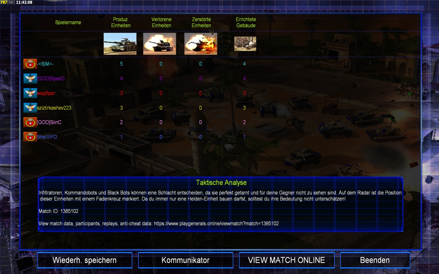 | Name | Side | Color | Team | Starting Position | Buildings Built | Buildings Lost | Buildings Destroyed | Units Built | Units Lost | Units Destroyed | Money Earned | Outcome |