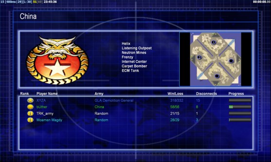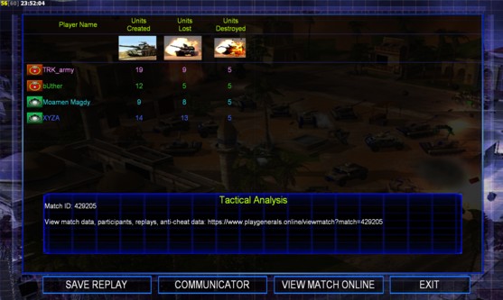 | Display Name | Side | Color | Team | Map Starting Position | Buildings Built | Buildings Destroyed | Buildings Lost | Units Built | Units Destroyed | Units Lost | Total Money Earned | Outcome |